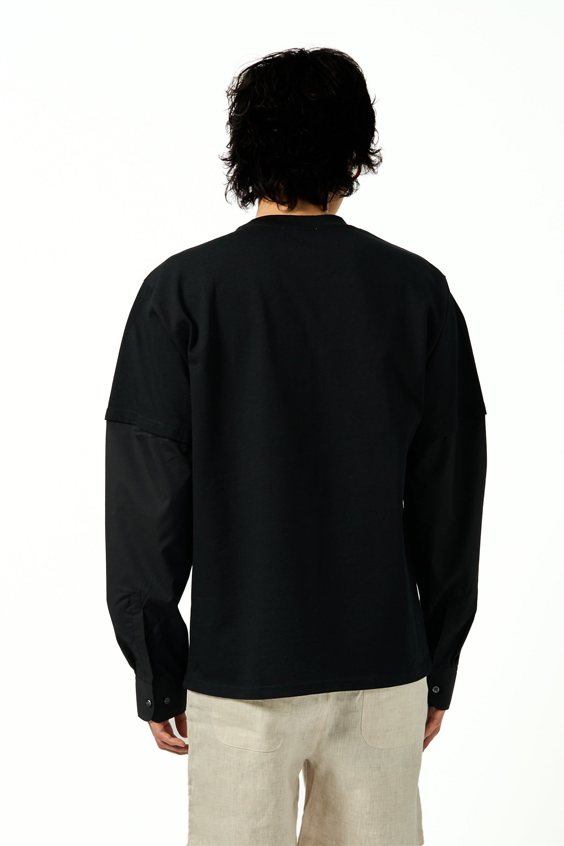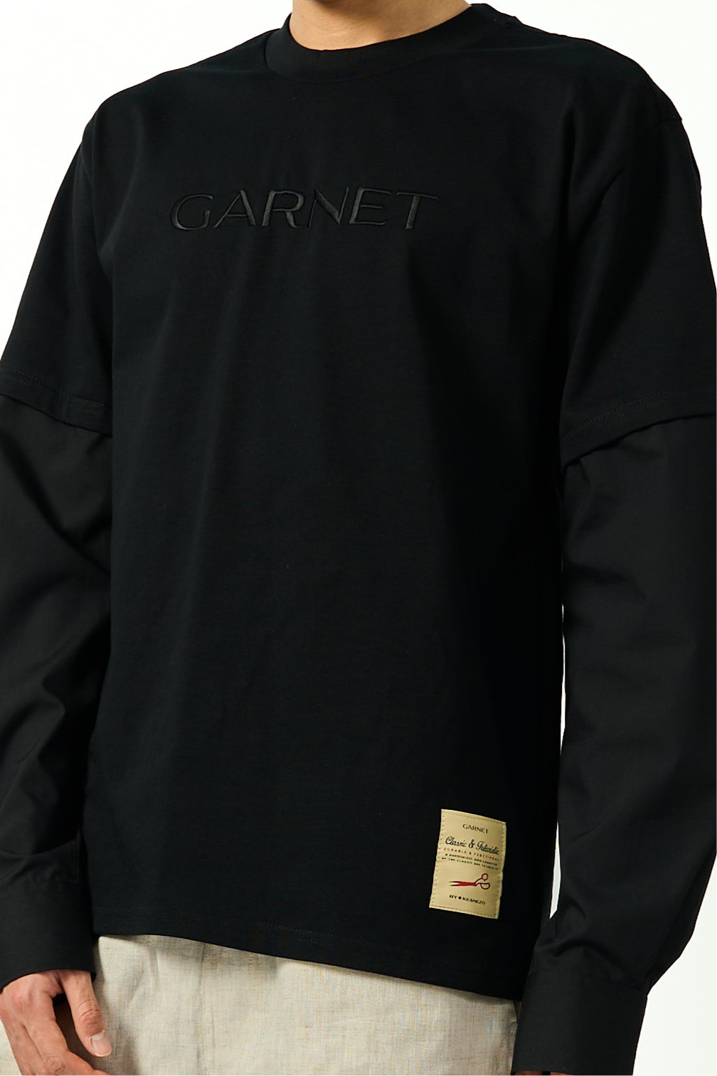 A unique long sleeve tee, featuring a poplin shirt sleeve, accompanied by the Garnet text embroidery at centre chest. A relaxed fit throughout. A overall subtle but elegant piece.