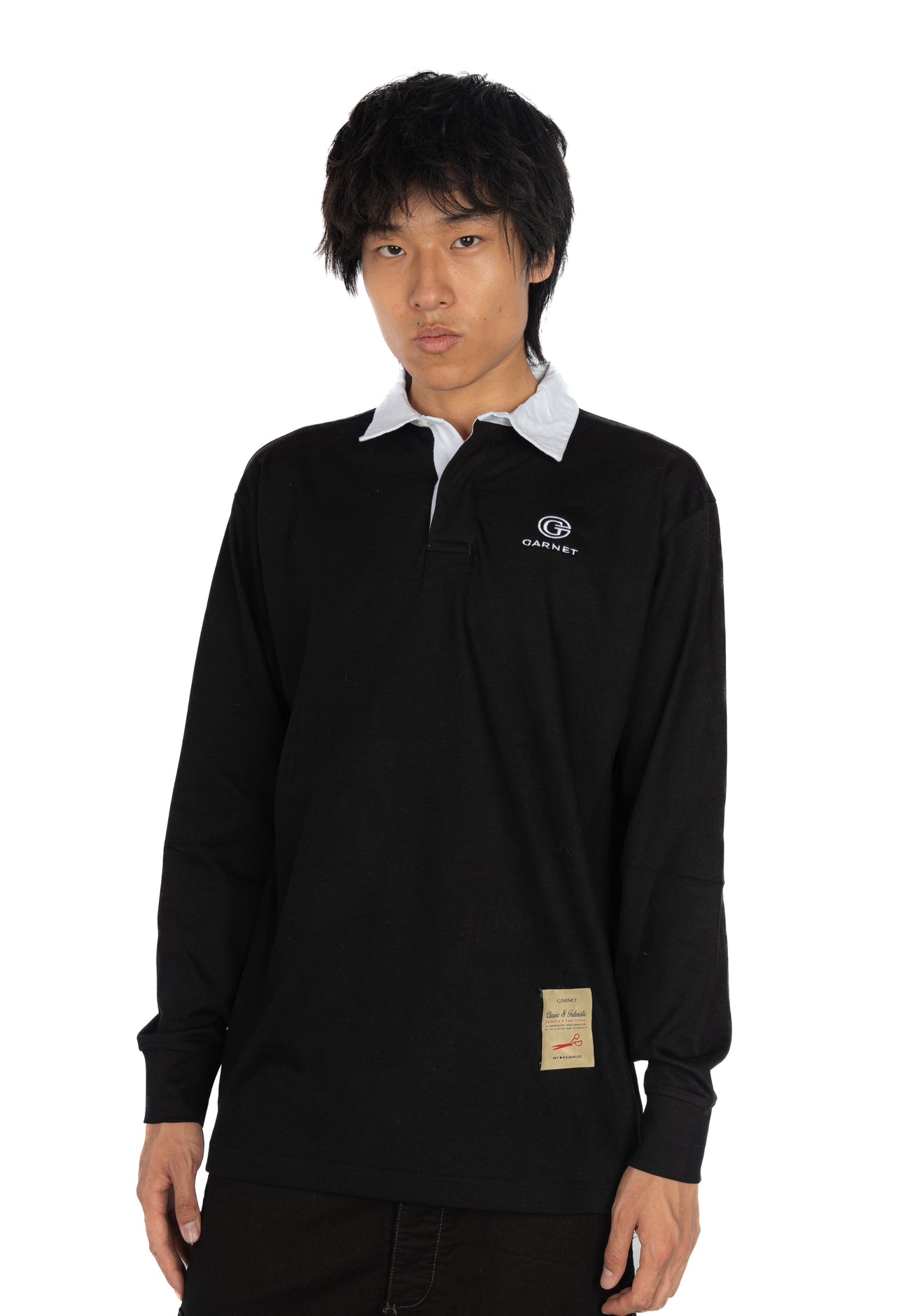 Featuring a relaxed throughout, embroidered garnet logo on left chest.
