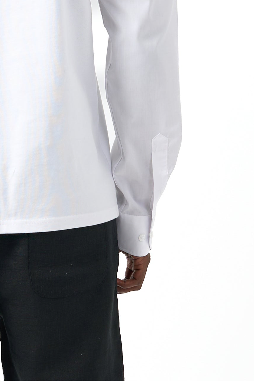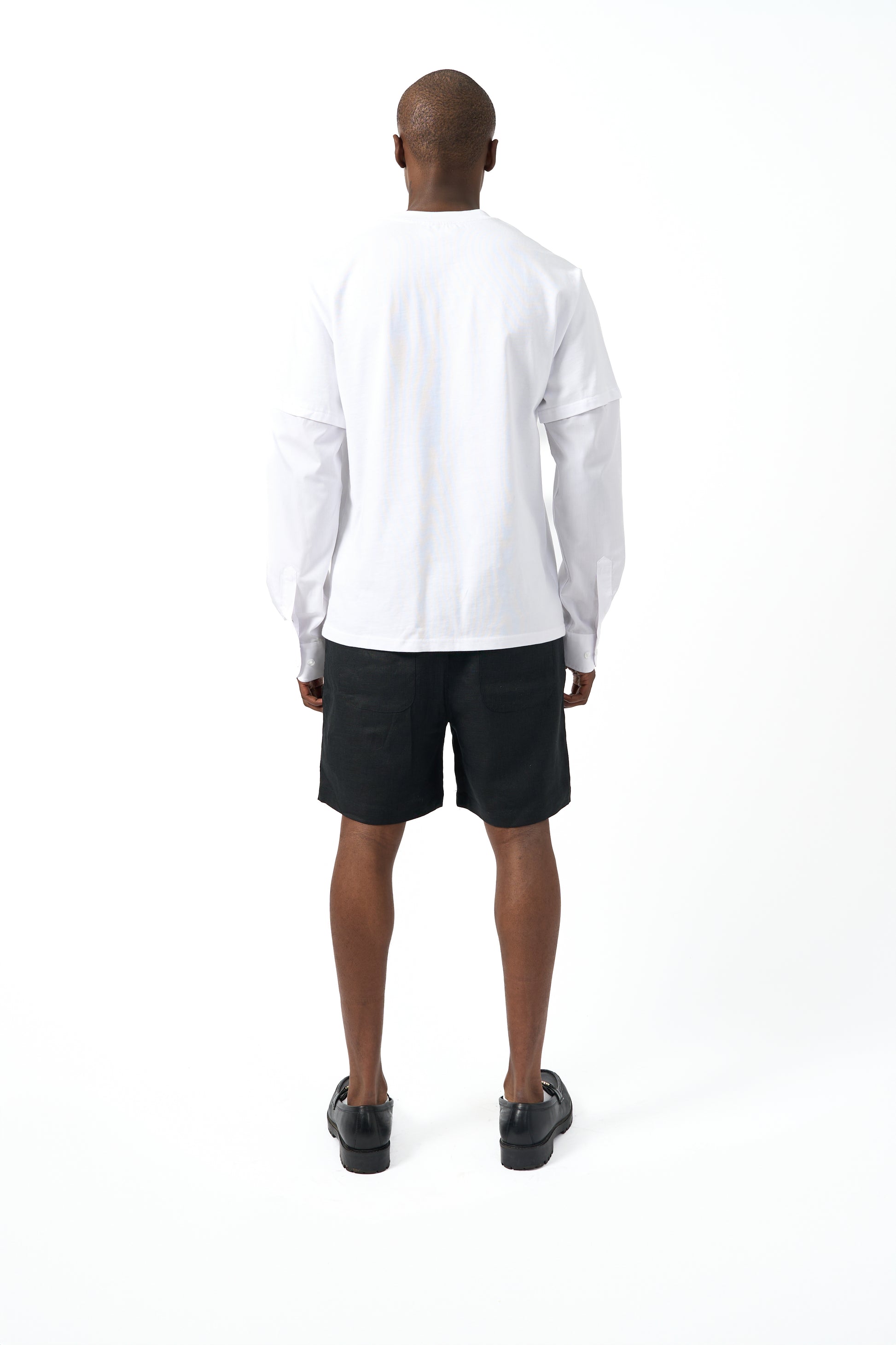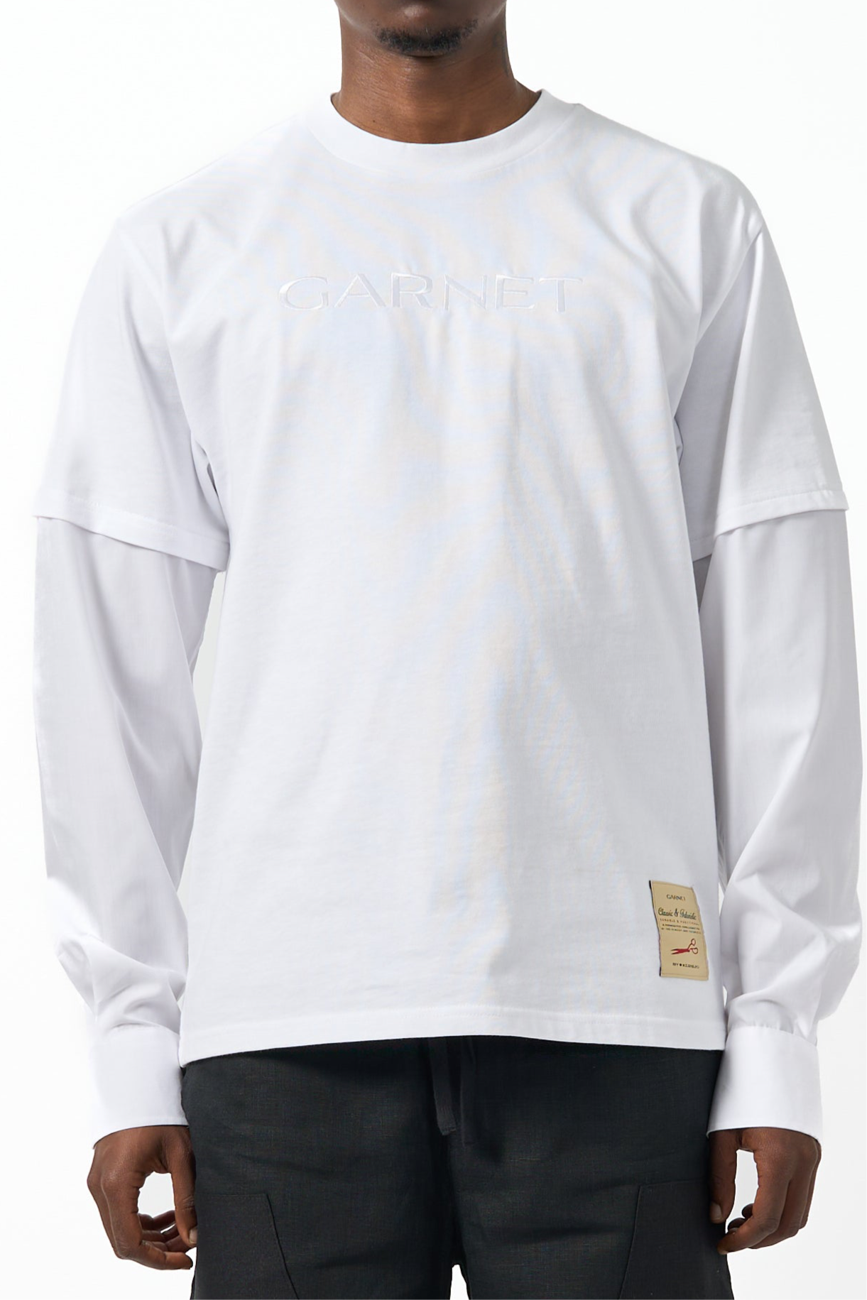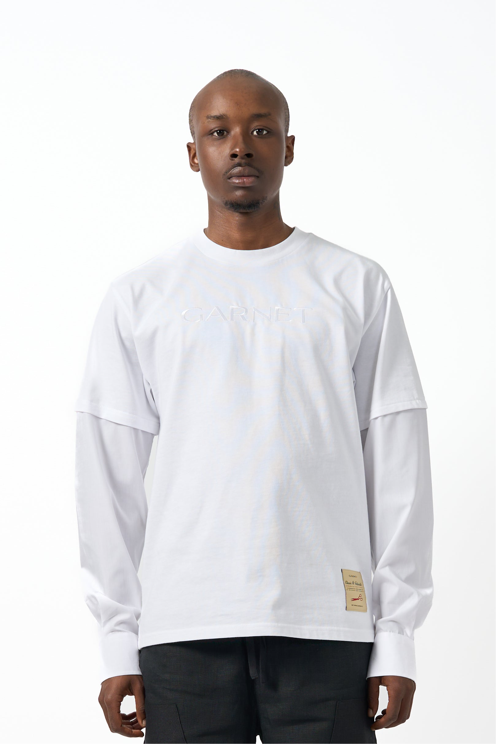 A unique long sleeve tee, featuring a poplin shirt sleeve, accompanied by the Garnet text embroidery at centre chest. A relaxed fit throughout. A overall subtle but elegant piece.